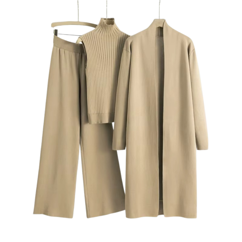 3-delat stickat set för kvinnor med lång kofta, polotröja och vida byxor