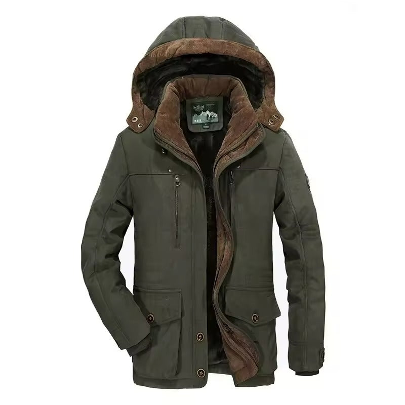 Denna herrvinterjacka i medellång modell är avsedd för kalla väderförhållanden och har ett tjockt fleecefoder som hjälper till att hålla värmen. Jackan har hel dragkedja framtill och knappslå, och passar för både medelålders och yngre män. Ett bra val för lager-på-lager och utomhusbruk under höst och vinter.