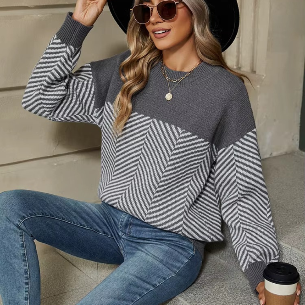 Damstickad fiskbensmönstrad tröja för kallare säsonger