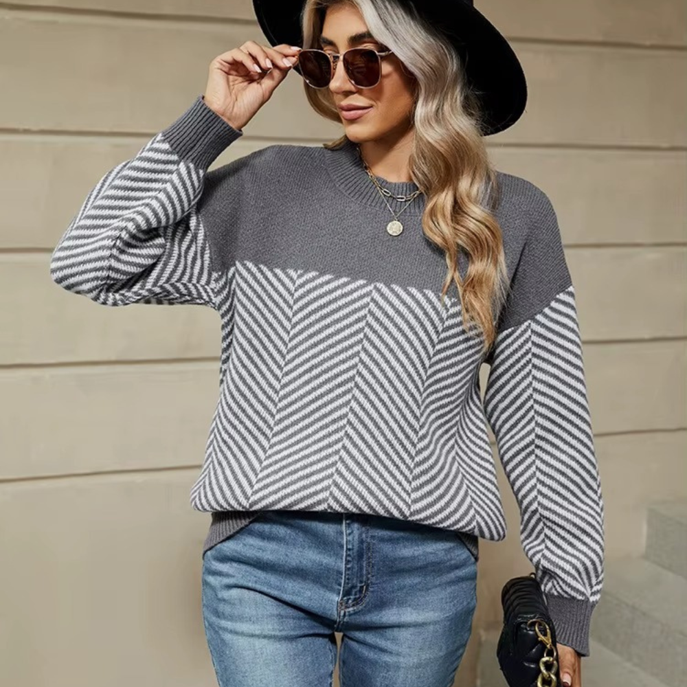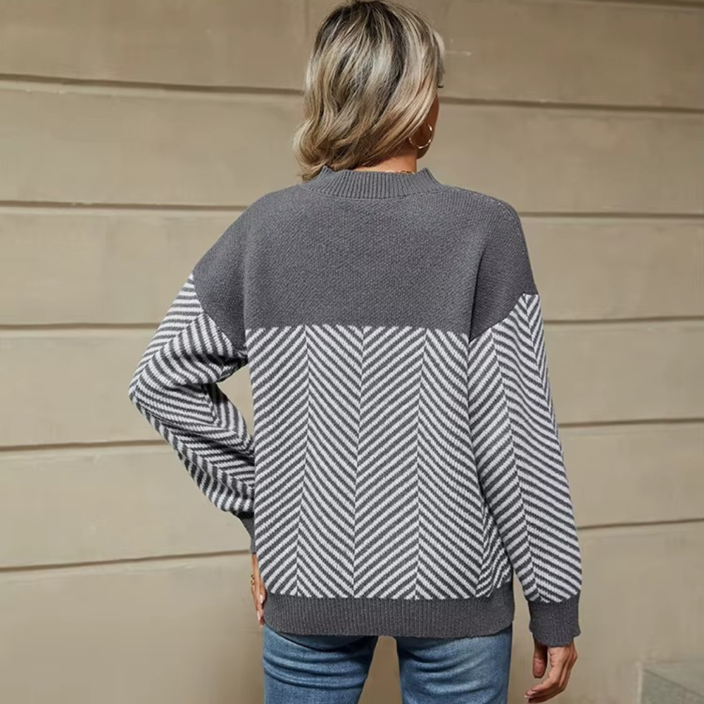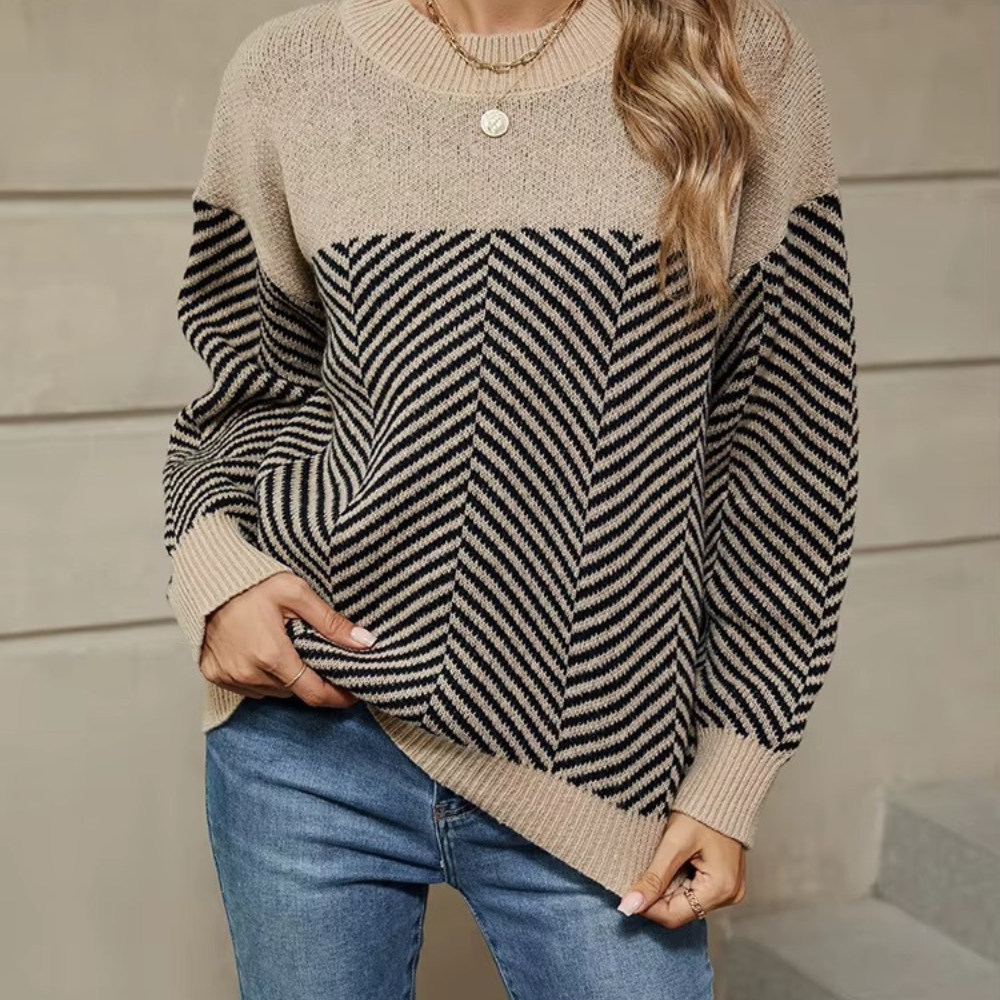 Den har en rund halsringning och vida ärmar som ger en modern twist till vardagliga lager-på-lager-plagg. Det vinklade randmönstret ger dimension till den enkla färgpaletten och gör den enkel att matcha med jeans eller kjolar. Perfekt för vardagligt bruk under höst- och vintersäsongen.