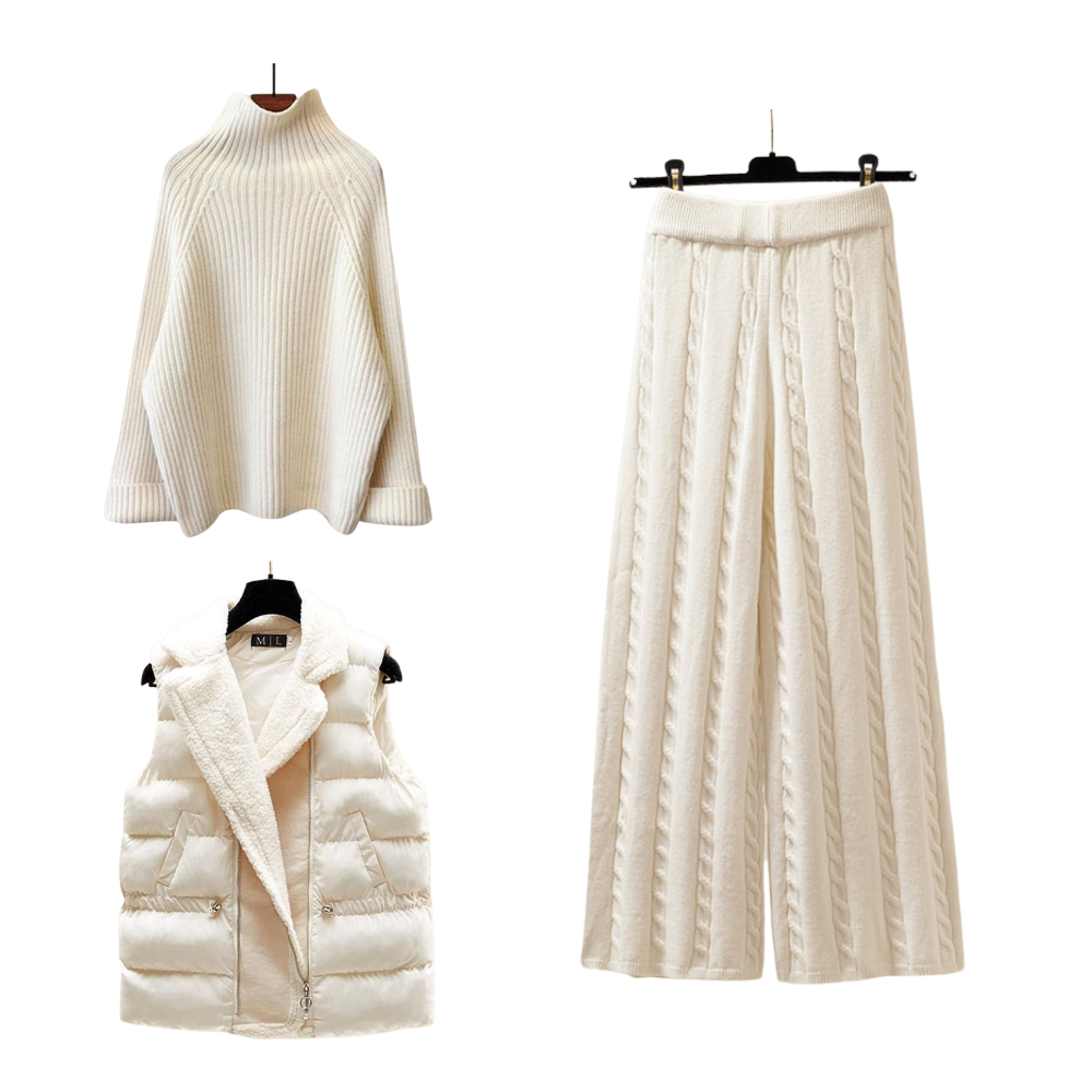 Detta stickade set består av en stickad tröja, byxor med hög midja och vida ben samt en väst med slagkrage. Den stickade polotröjan matchar byxorna för en enhetlig helhet. Västen ger ett extra lager för isolering och stil.